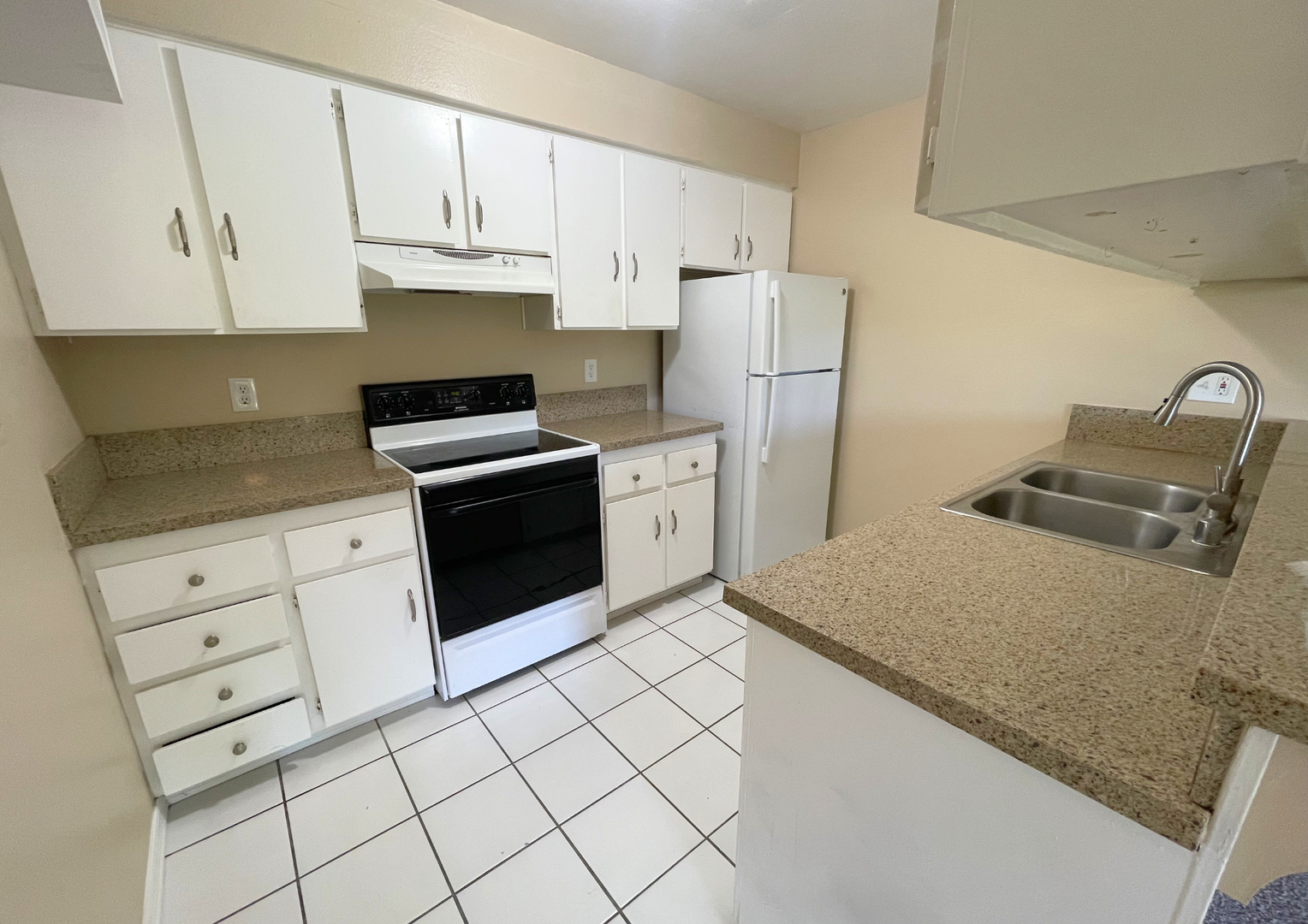 The oversized living and dining area creates an ideal setting for both relaxing and entertaining, while large sliding glass doors open to a private patio overlooking lush landscaped grounds and mature greenery, providing a peaceful indoor-outdoor living experience rarely found in condo living. The bright kitchen offers generous counter space, ample cabinetry, and a functional layout perfect for everyday cooking and hosting alike.