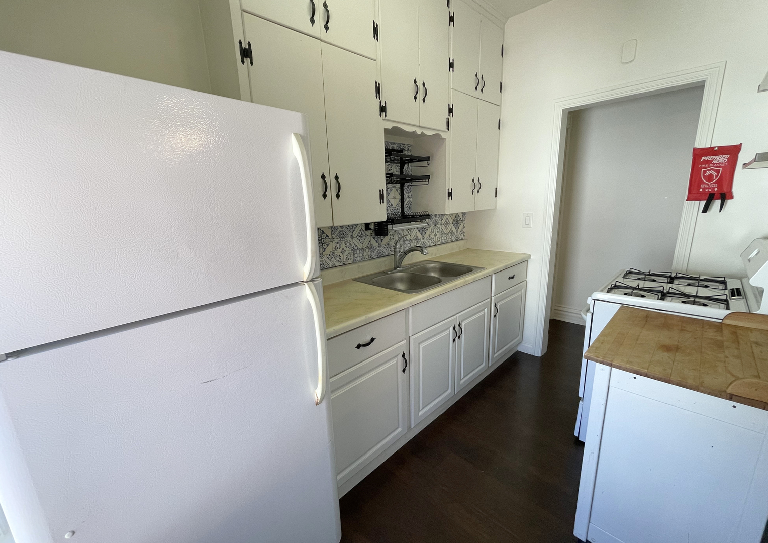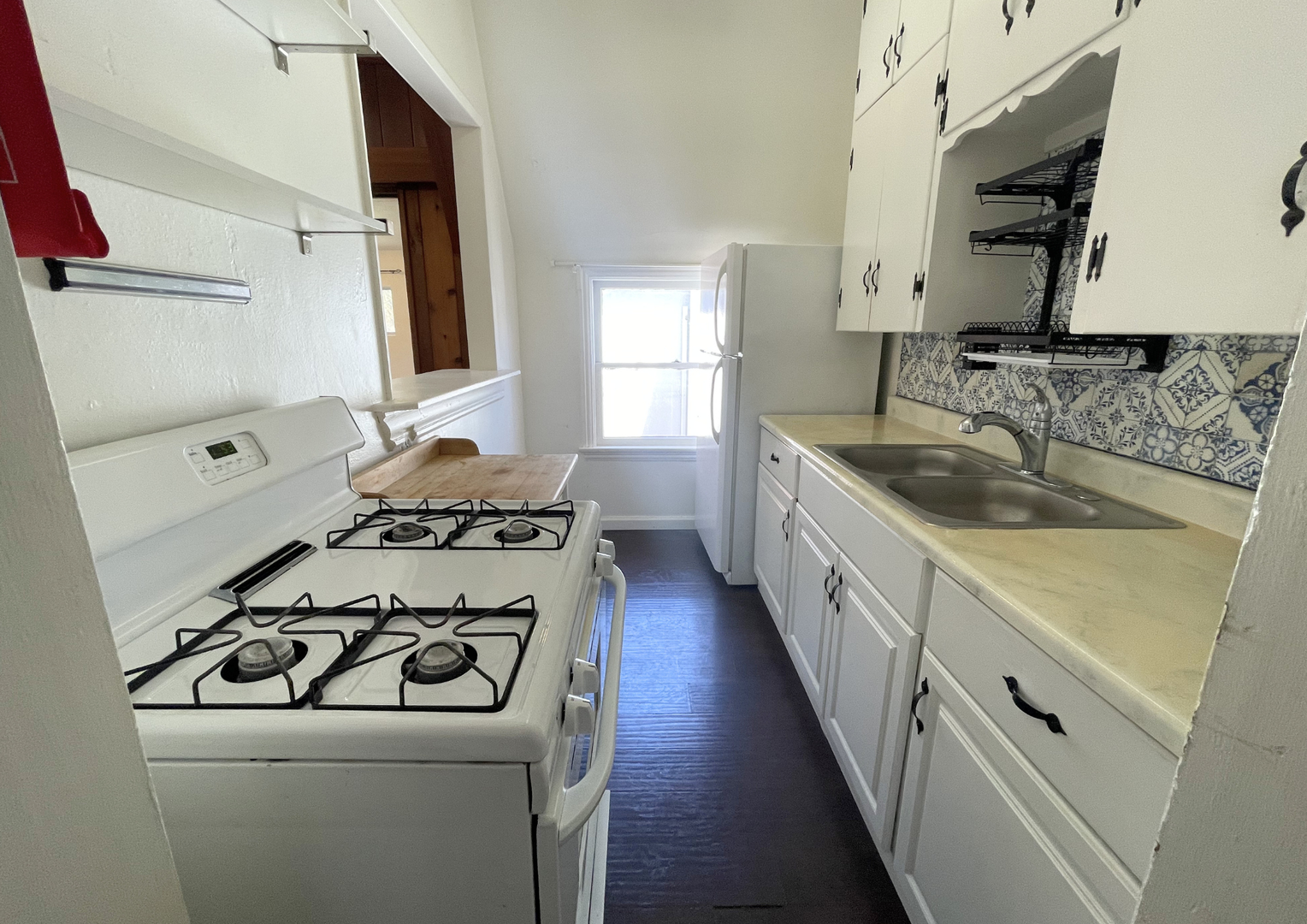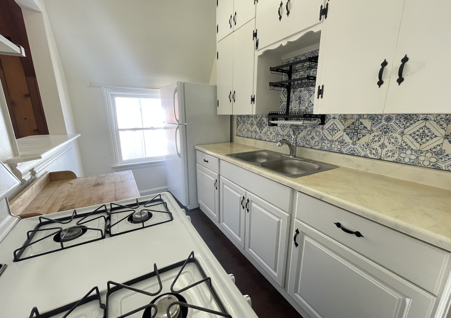 The kitchen showcases timeless cabinetry, ample counter space, and a stylish patterned backsplash, creating a functional yet charming cooking space. The bedroom is generously sized with beautiful hardwood floors and classic detailing, while the bathroom is clean and well-appointed with updated fixtures.