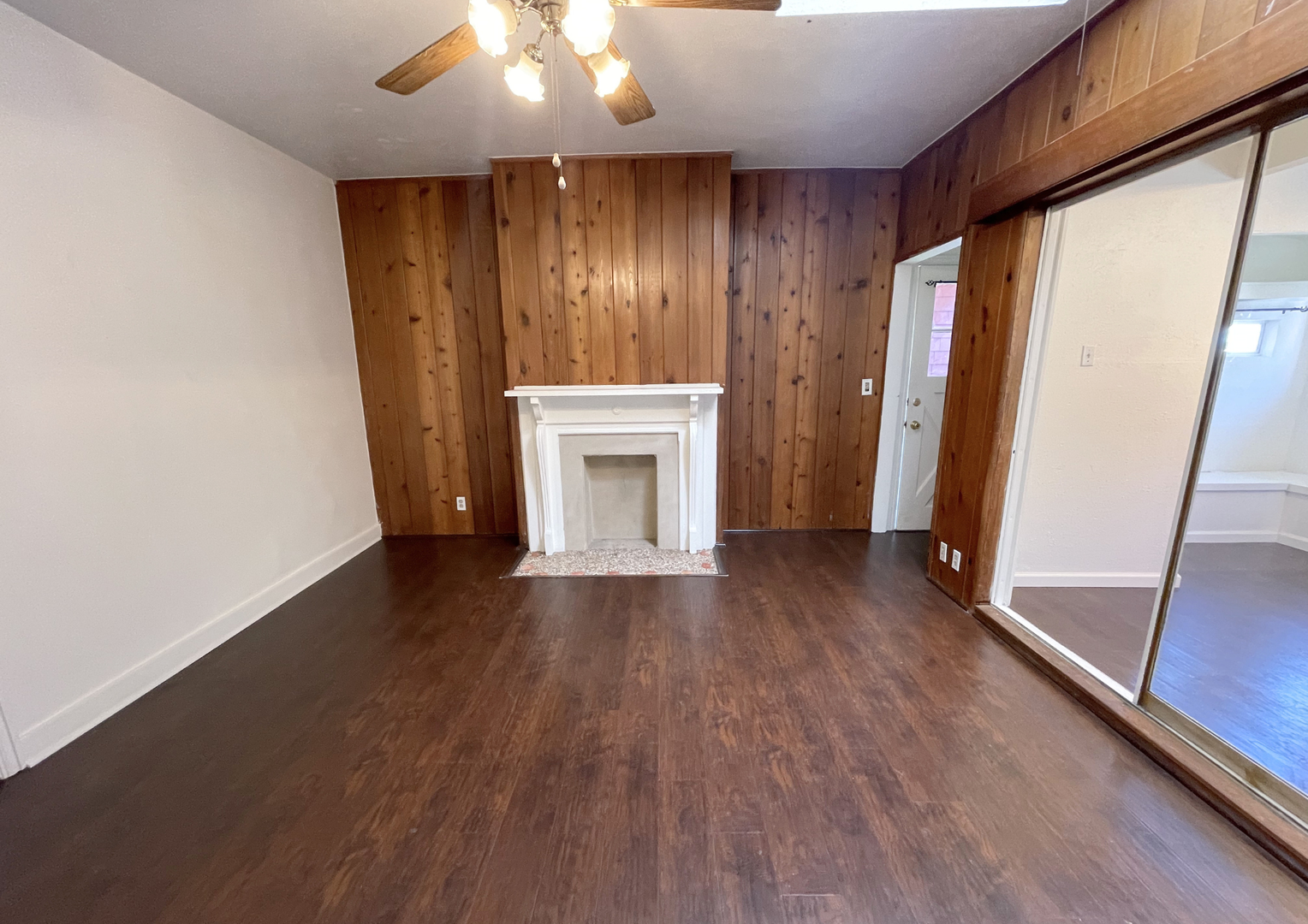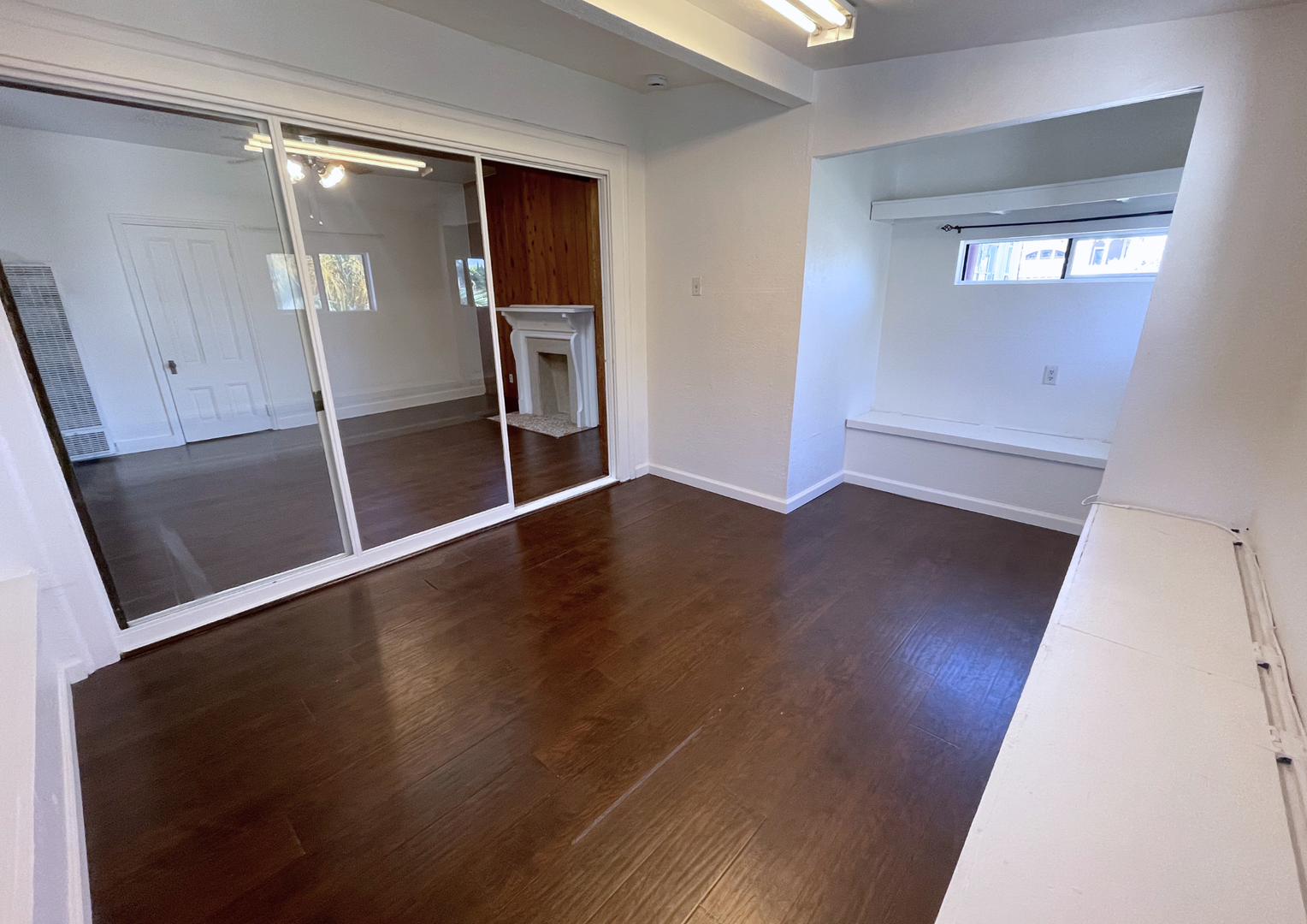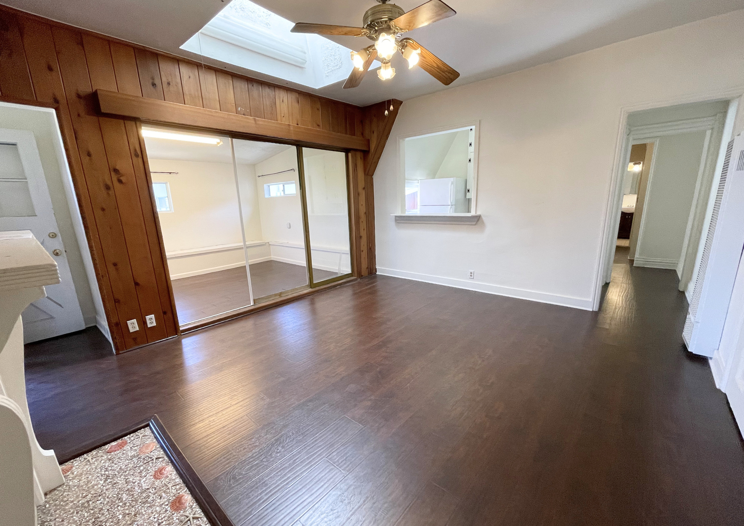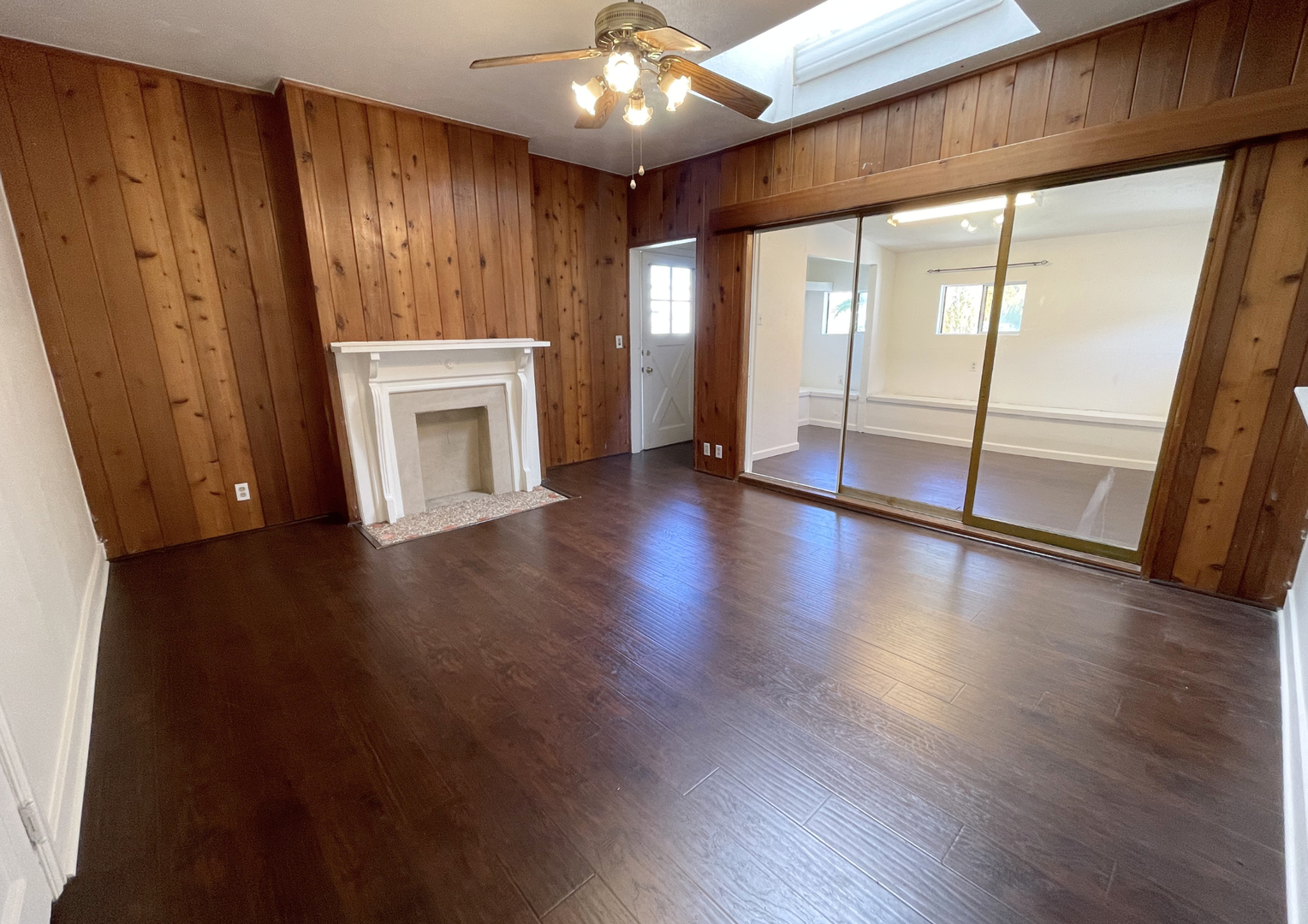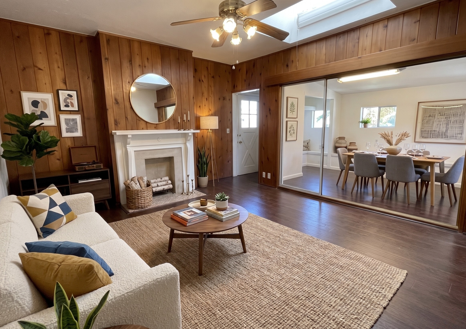 The inviting living room offers a warm, open layout with rich wood accents, a decorative fireplace, and a skylight that fills the space with natural light. Adjacent to the living area is a versatile bonus room—perfect for a home office, creative studio, or additional lounge space—complete with built-in bench seating and mirrored closet doors.