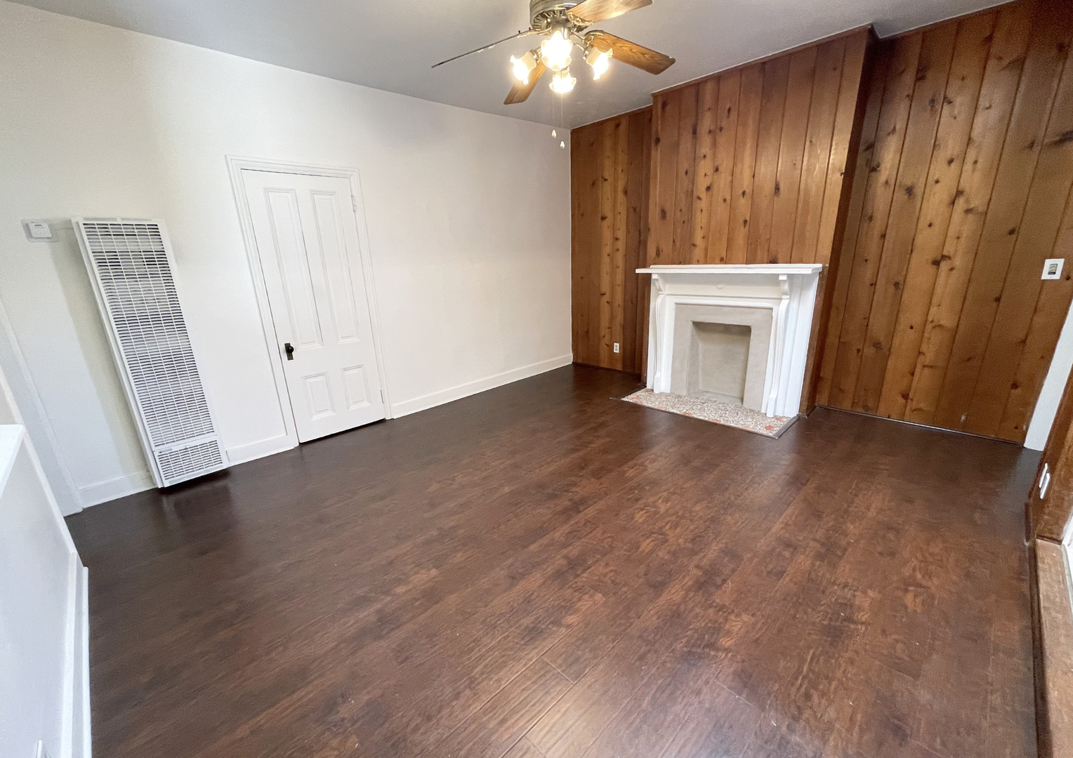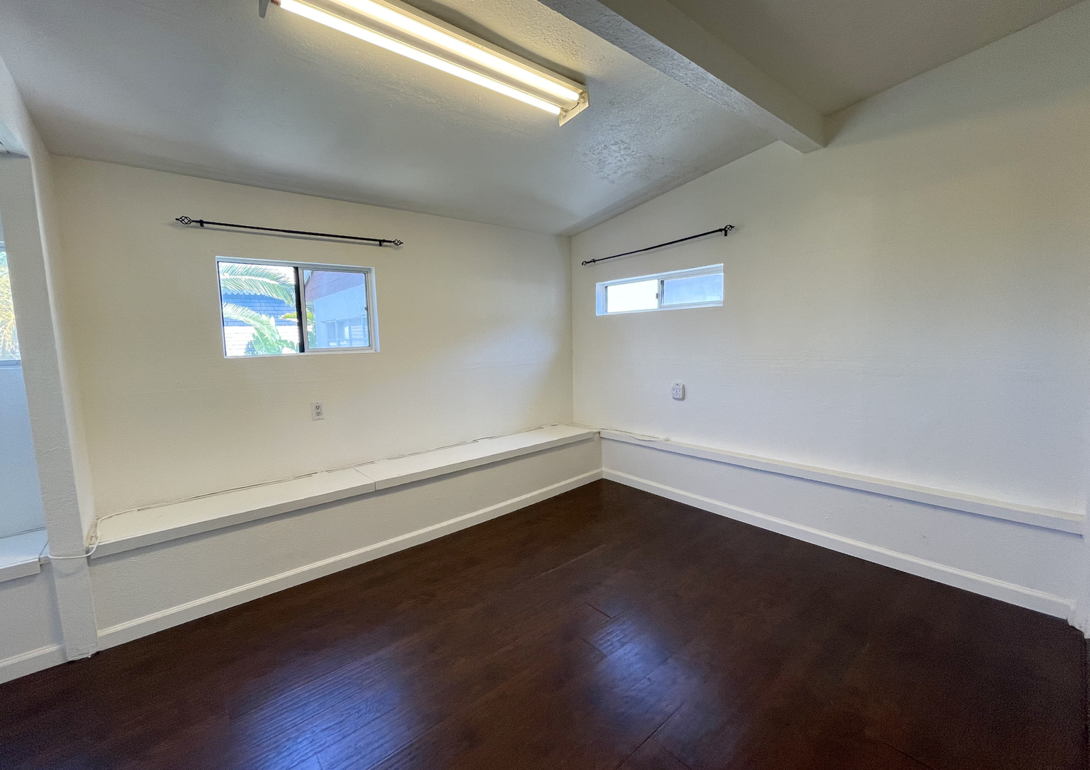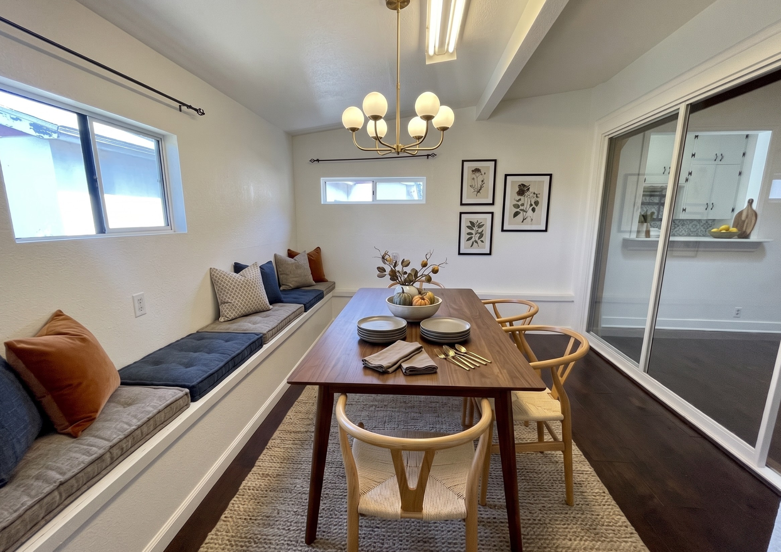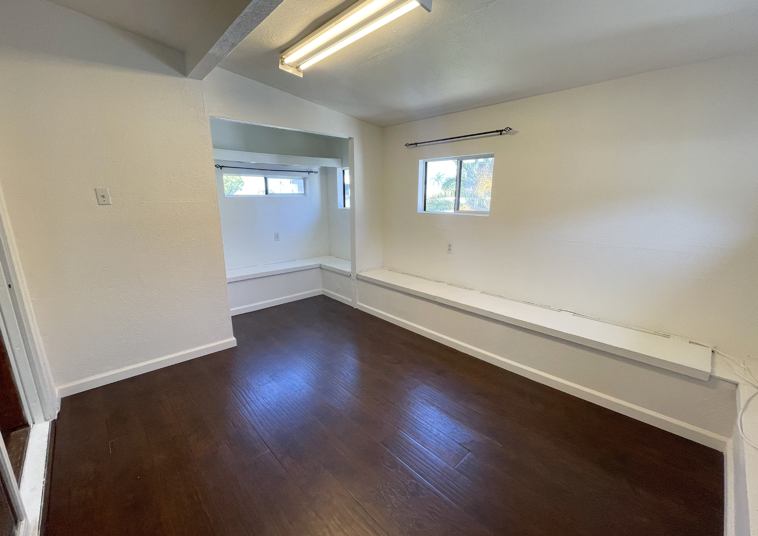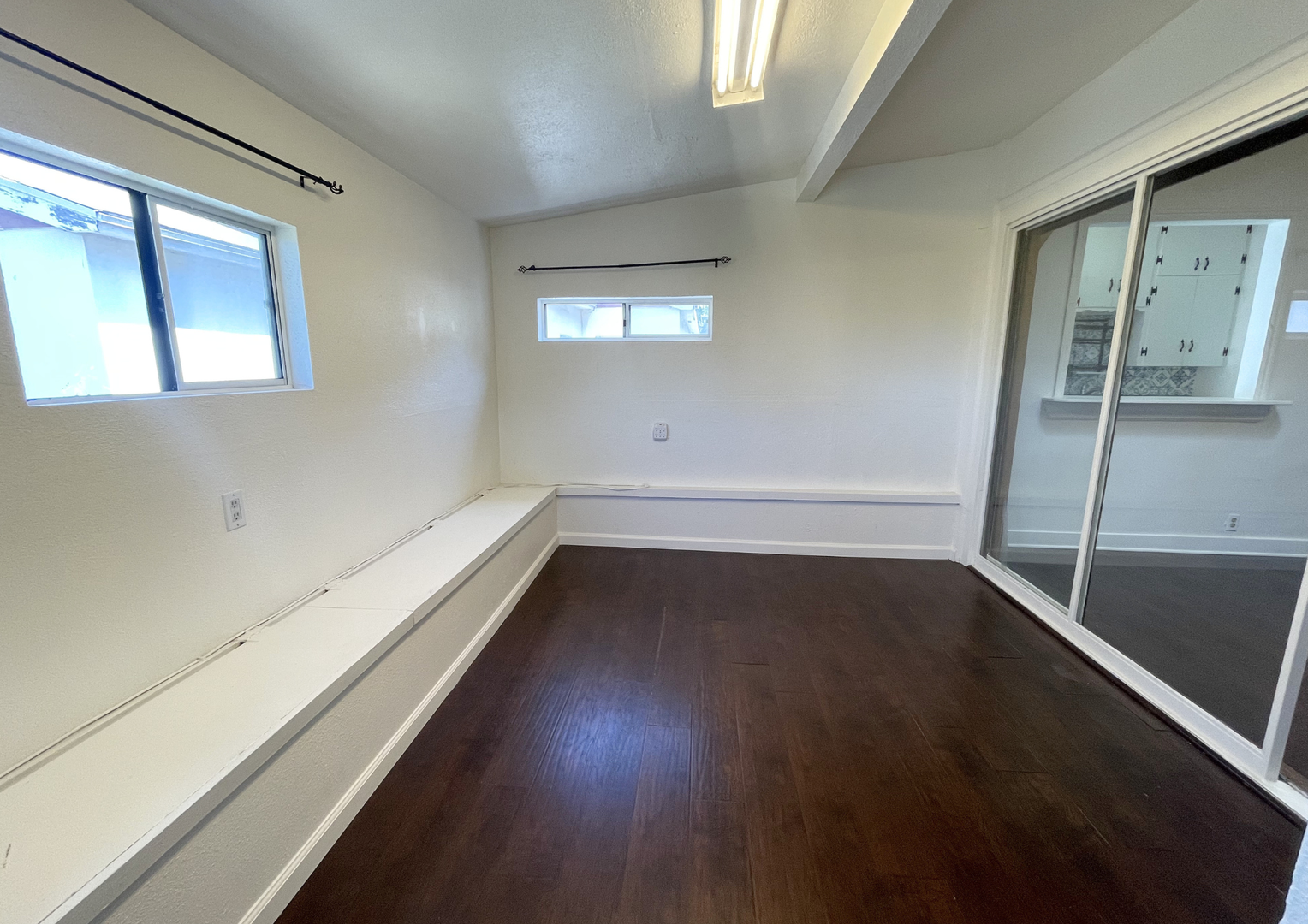 The inviting living room offers a warm, open layout with rich wood accents, a decorative fireplace, and a skylight that fills the space with natural light. Adjacent to the living area is a versatile bonus room—perfect for a home office, creative studio, or additional lounge space—complete with built-in bench seating and mirrored closet doors.